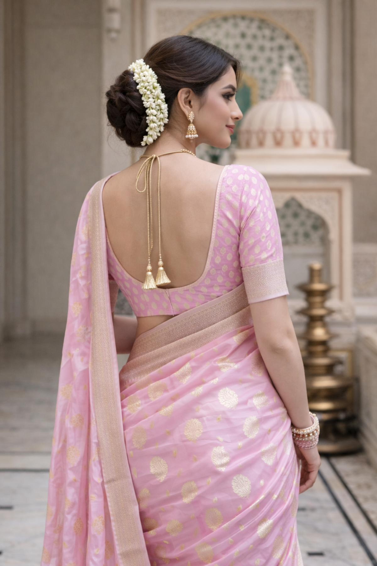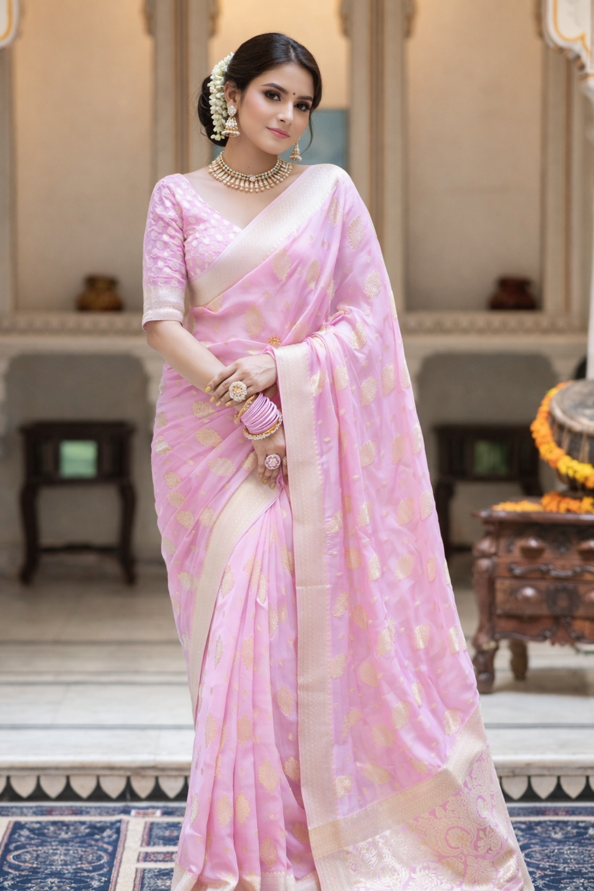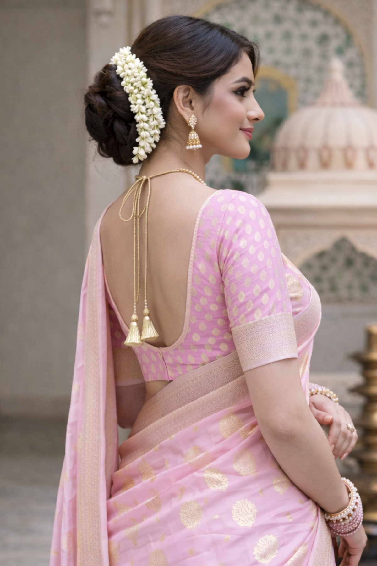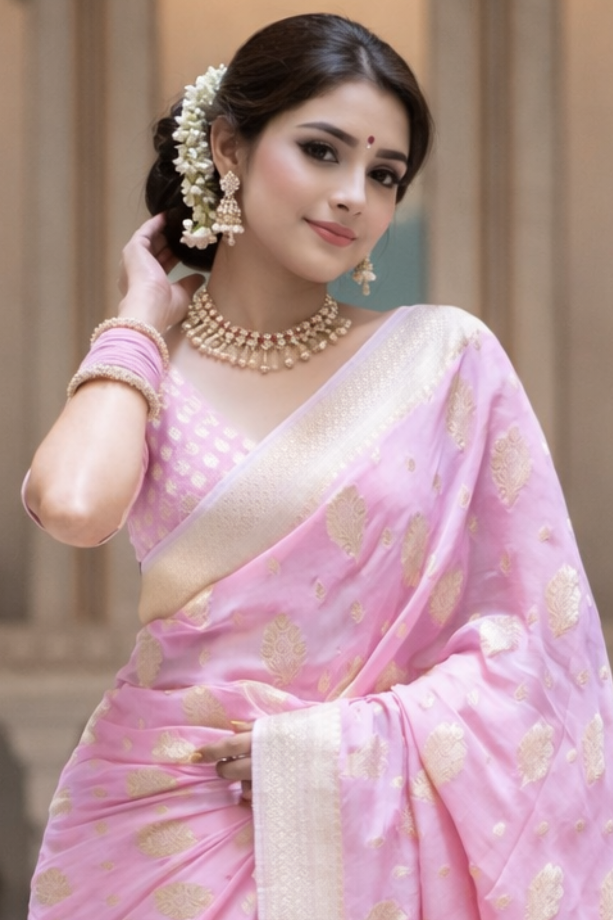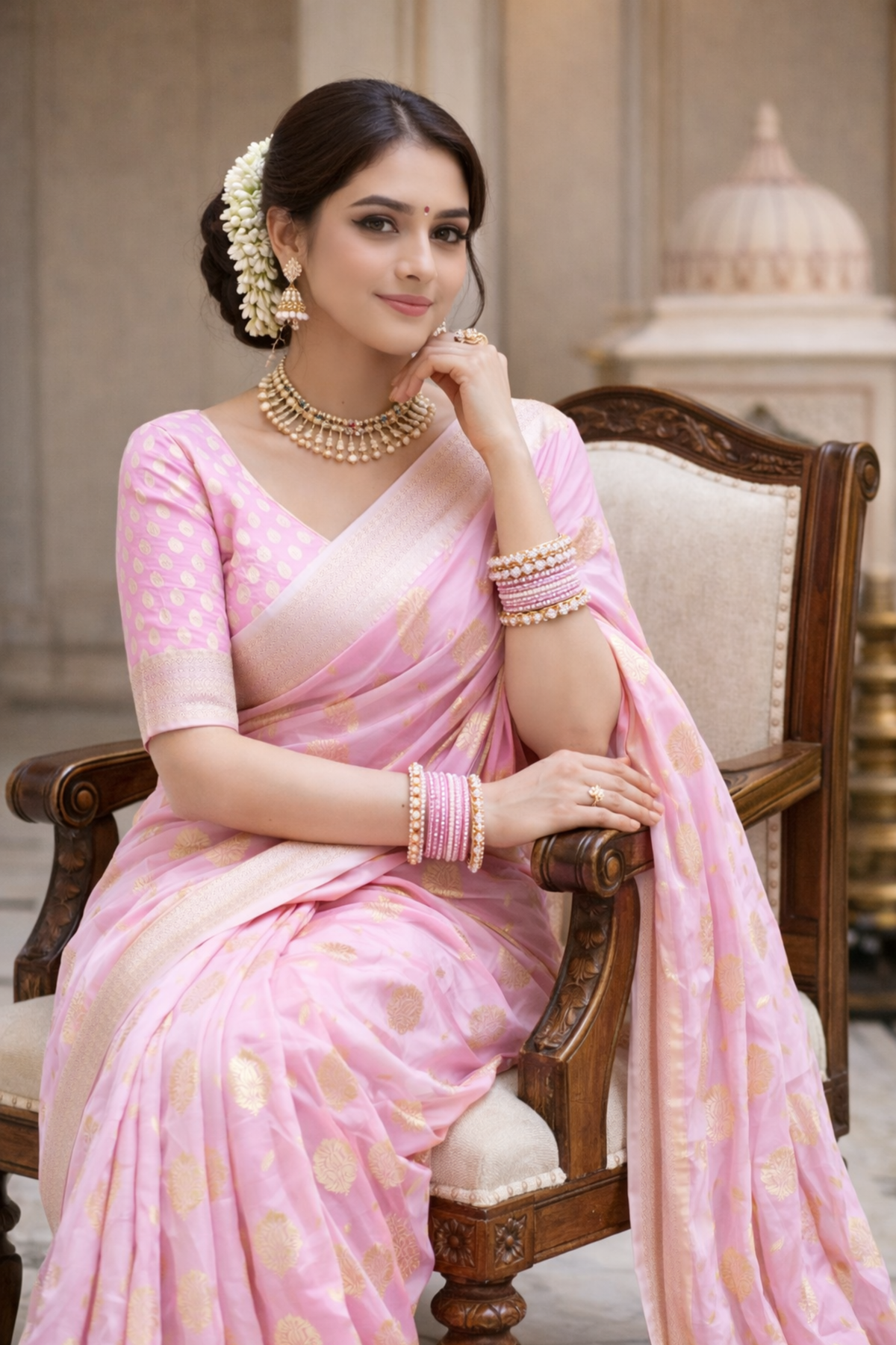 Ruvana Fashion Baby Pink Soft Litchi Silk Saree with Gold Zari Butti & Elegant Woven Border – Festive & Wedding Wear