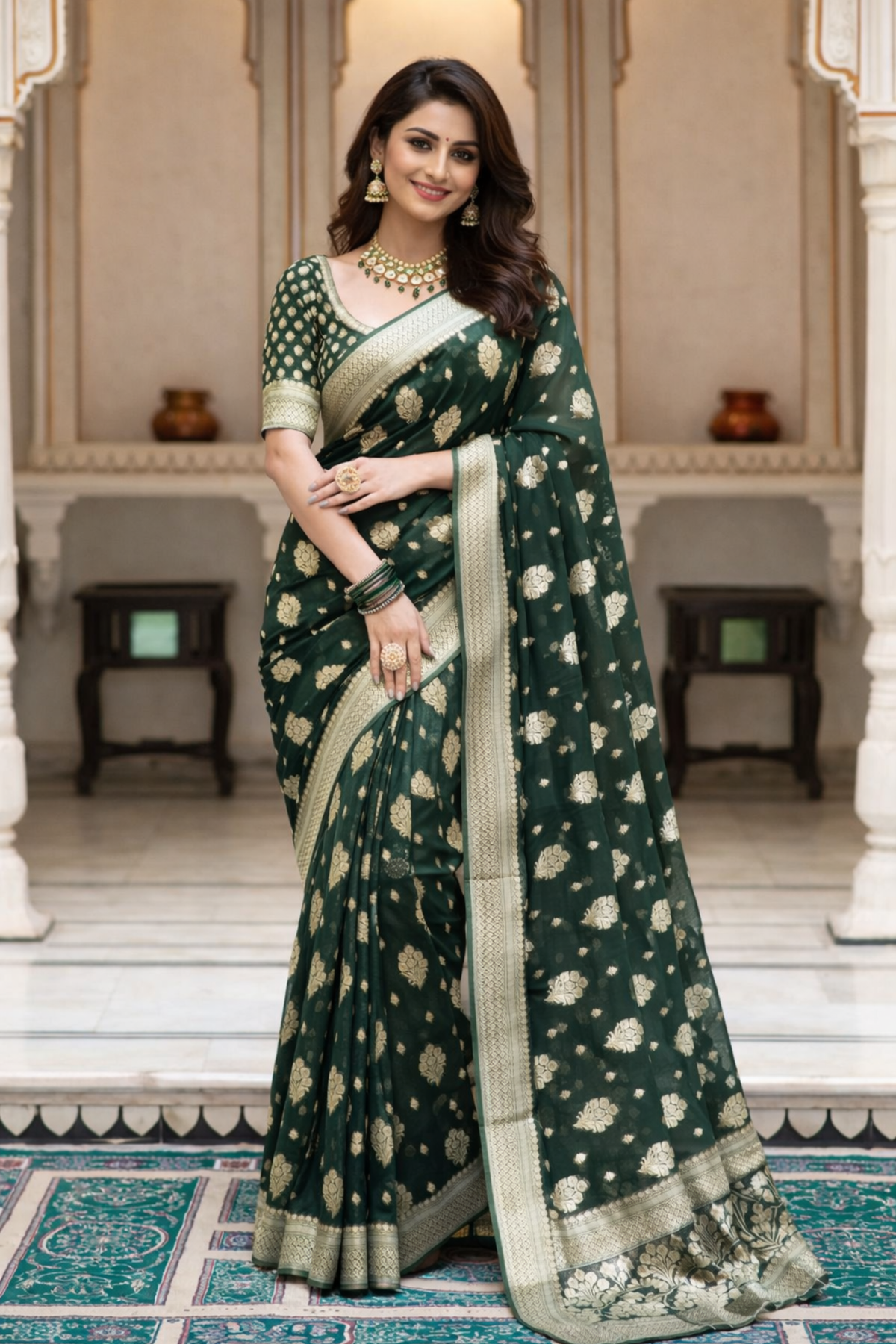 Ruvana Fashion Dark Green Soft Litchi Silk Saree with Gold Zari Butti & Rich Traditional Border