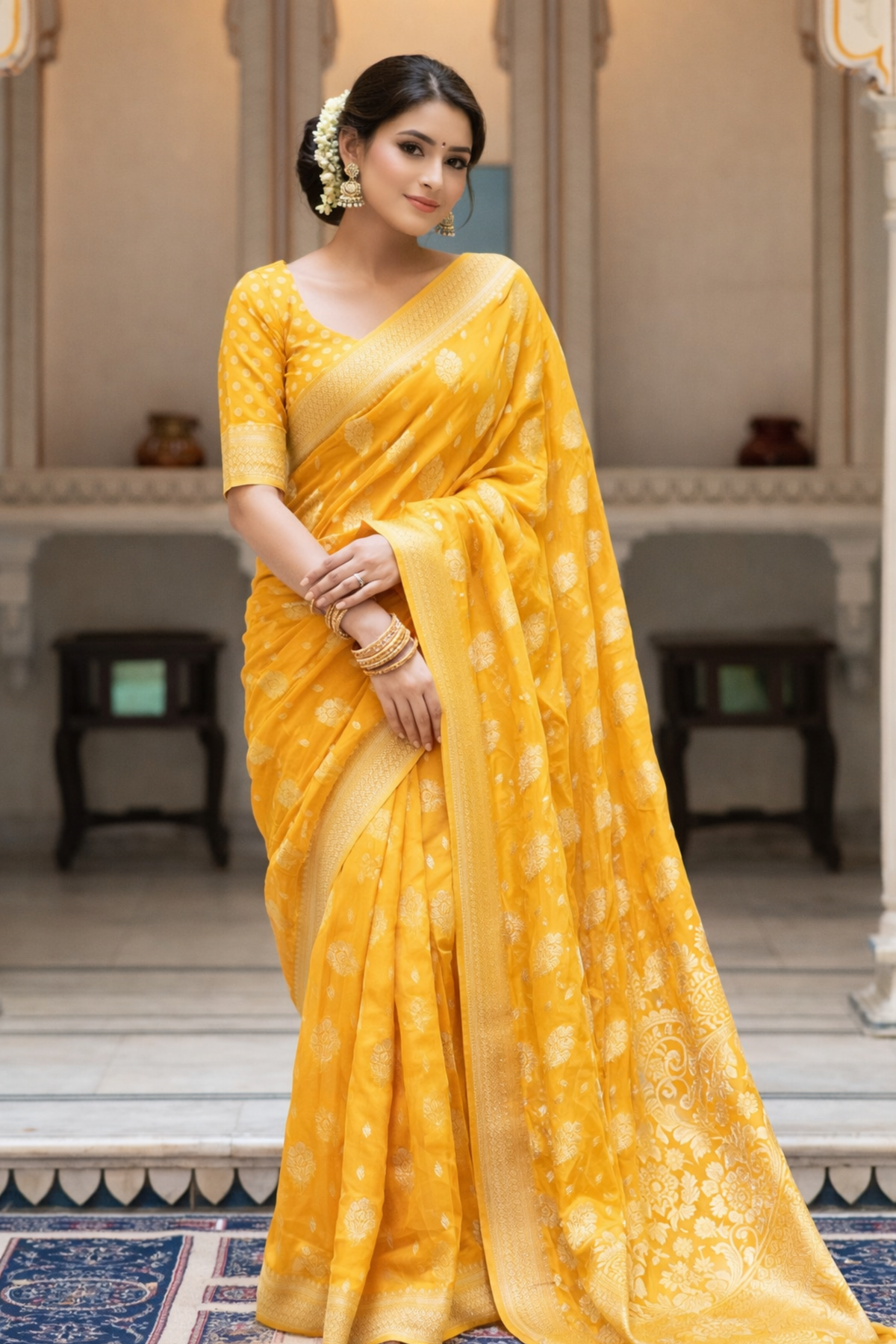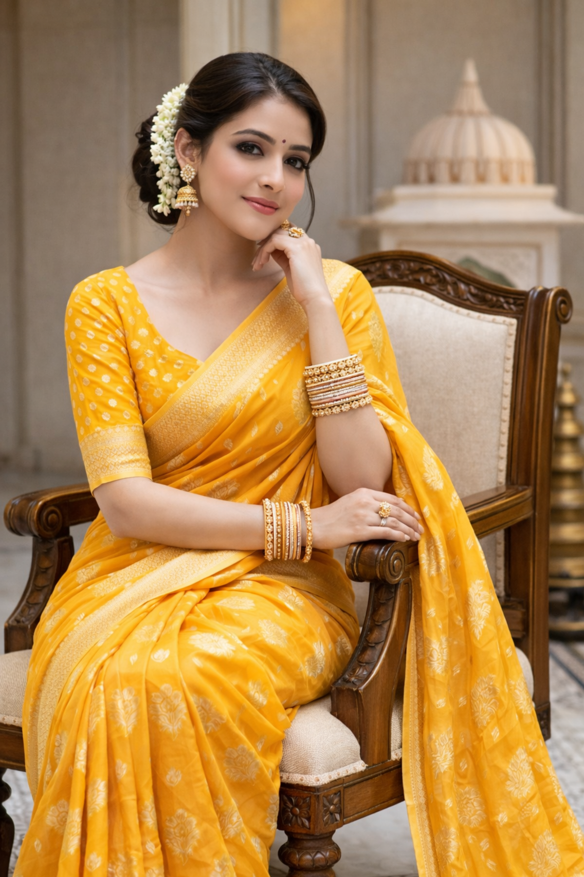 Ruvana Fashion Mustard Yellow Soft Litchi Silk Saree with Gold Zari Butti & Rich Elegant Border – Festive & Wedding Wear