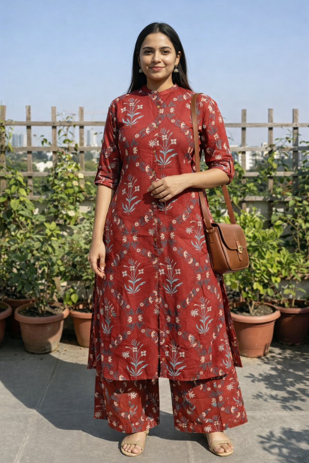 Maroon Floral Printed Cotton Kurta Palazzo Set for Women