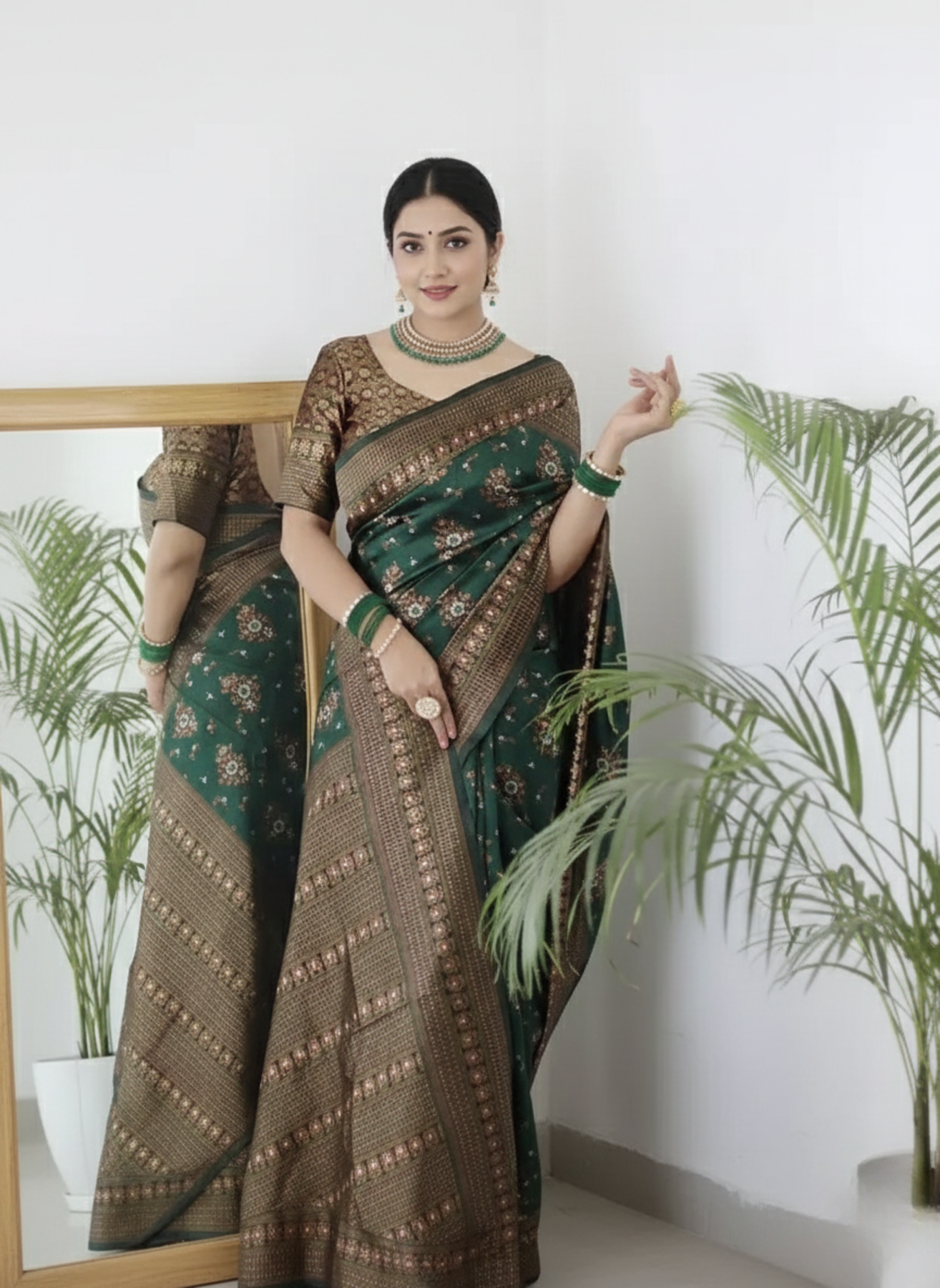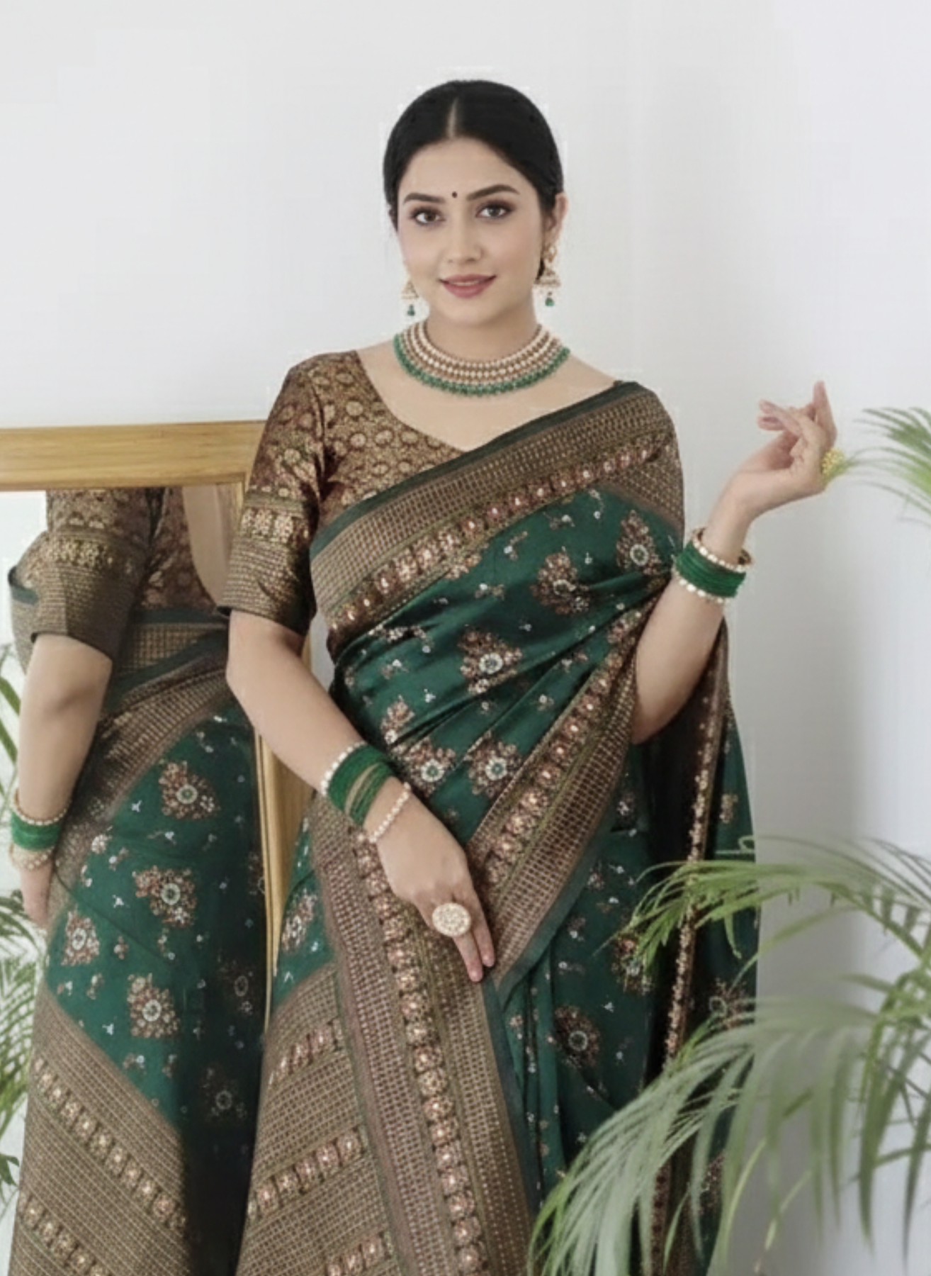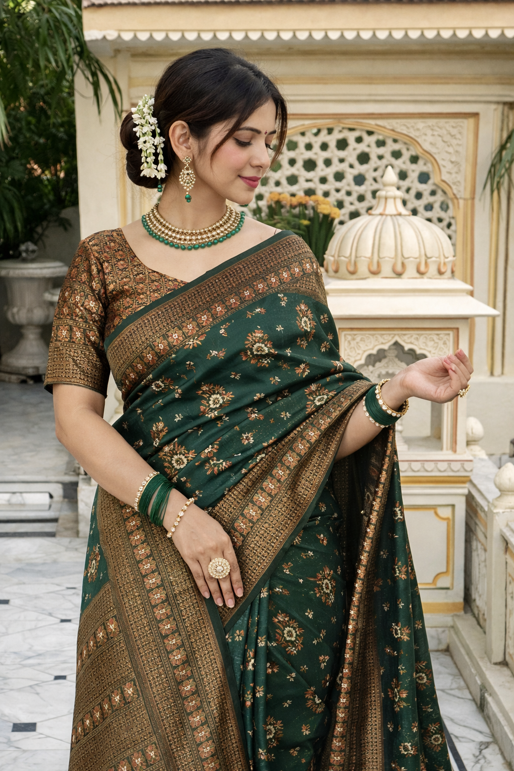 Ruvana Fashion Bottle Green Semi Soft Litchi Silk Saree with Rich Woven Border