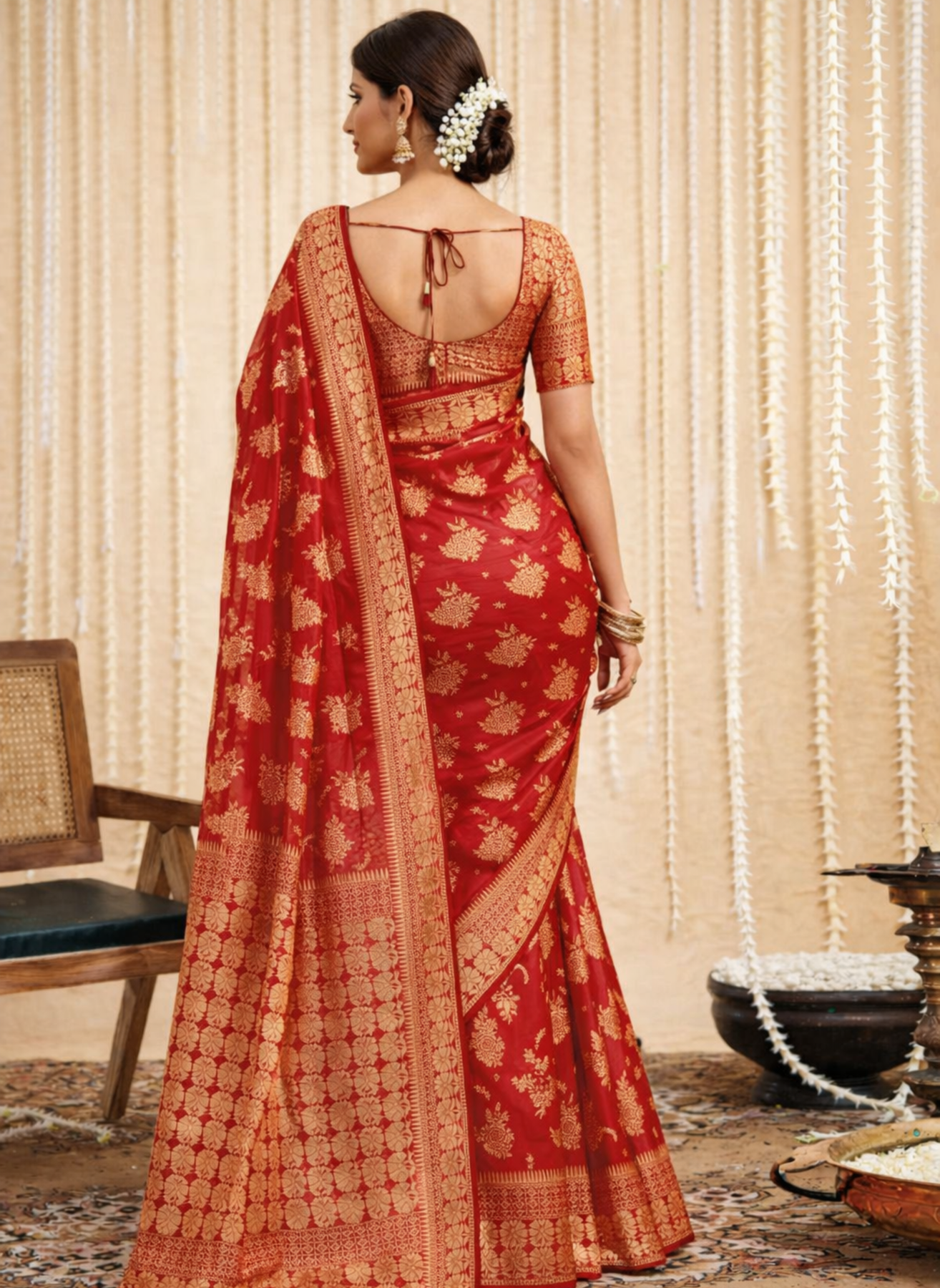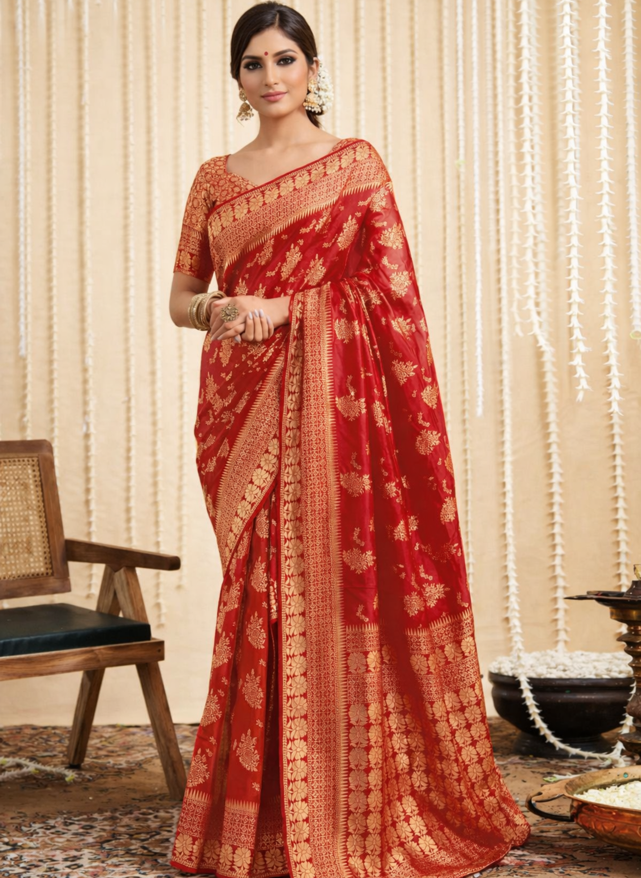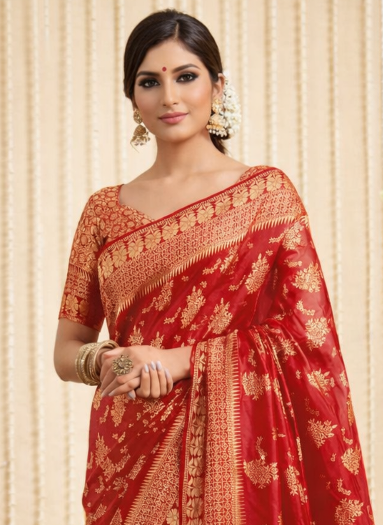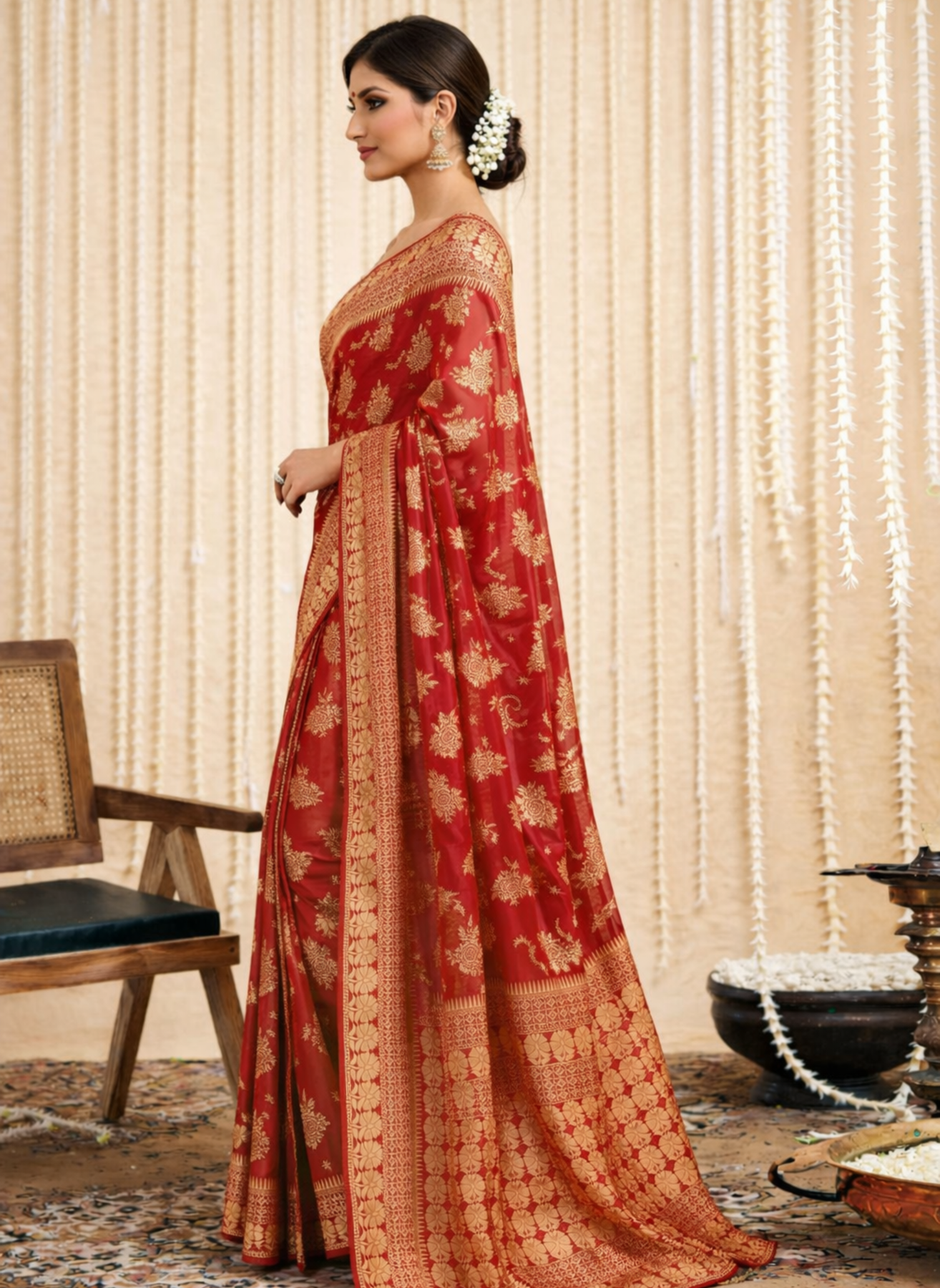 Ruvana Fashion Classic Red Semi Soft Litchi Silk Saree with Rich Golden Zari Border