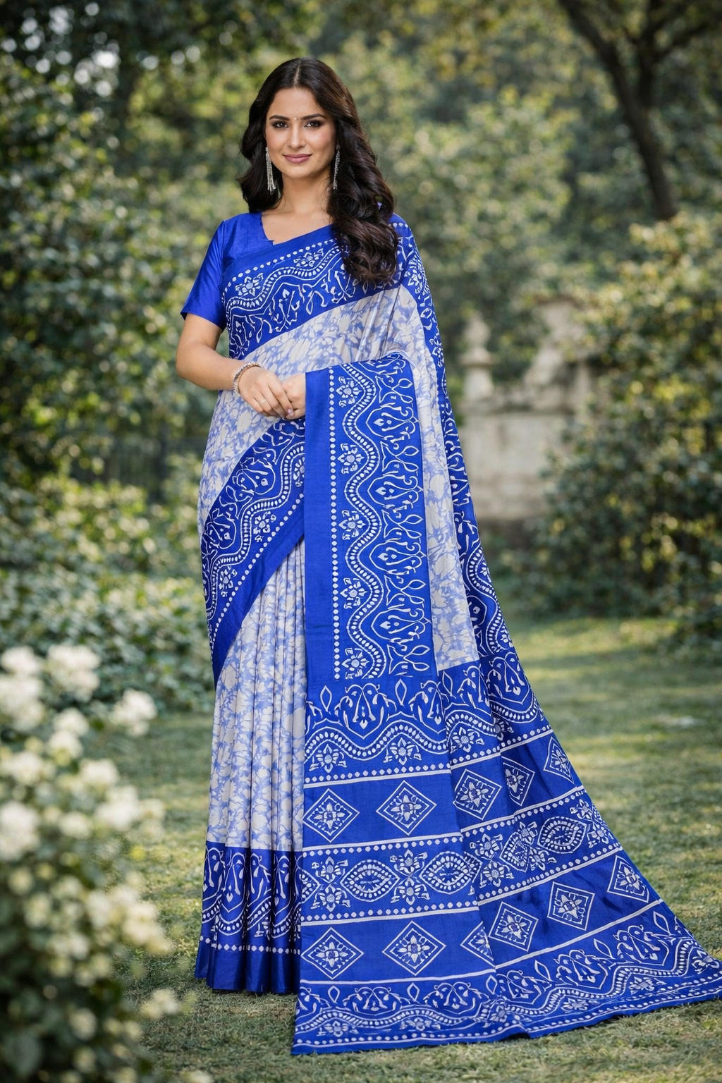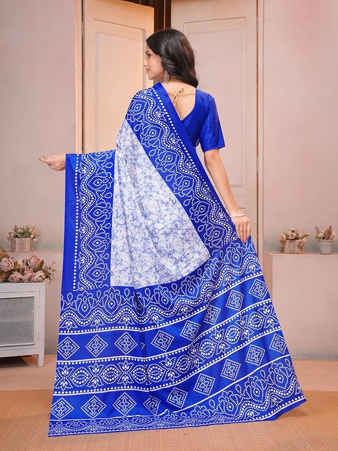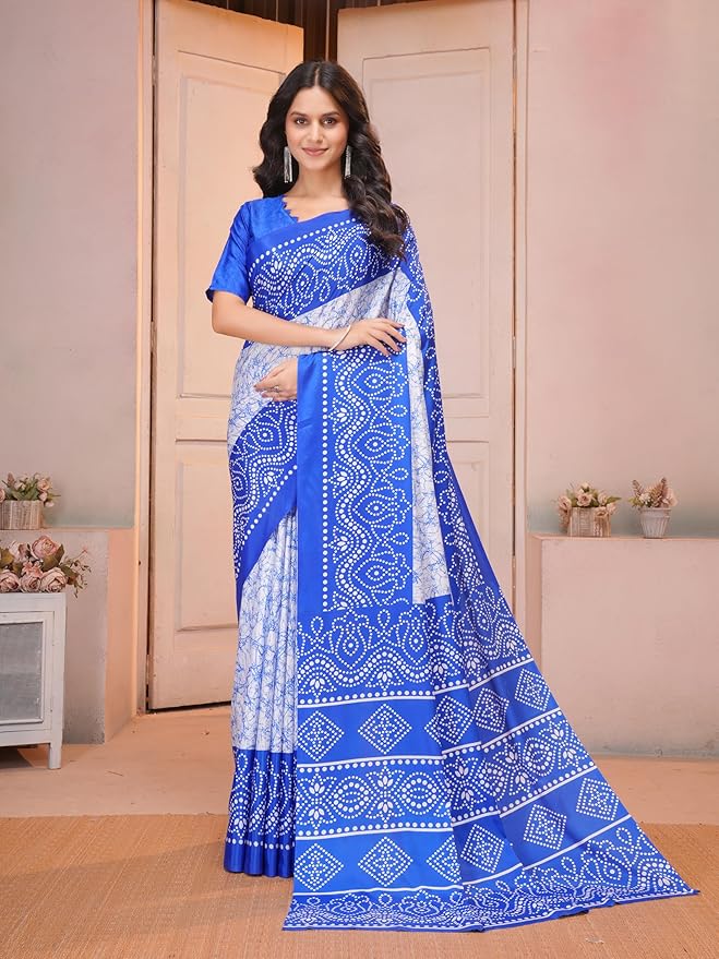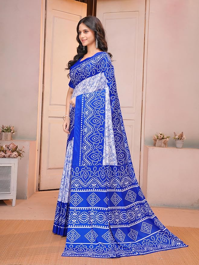 Crafted from lightweight crepe fabric, it offers a smooth, flowy drape that is easy to carry throughout the day. The rich royal blue base paired with delicate white Bandhani patterns makes it perfect for daily wear, festive occasions, casual outings, and office functions. The saree comes with an unstitched matching blouse piece, allowing you to customize the fit as per your style.