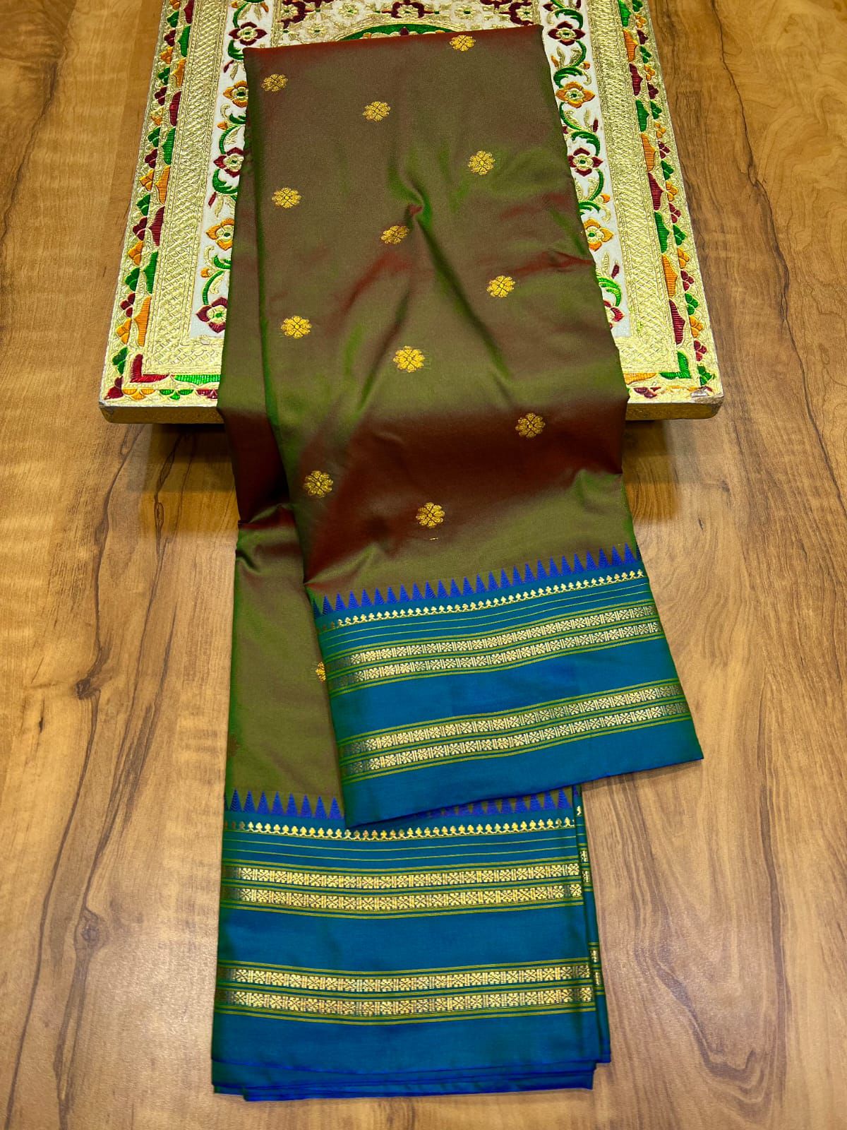 Classic Maharashtrian Paithani Saree in Olive Green & Peacock Blue by Ruvana Fashion