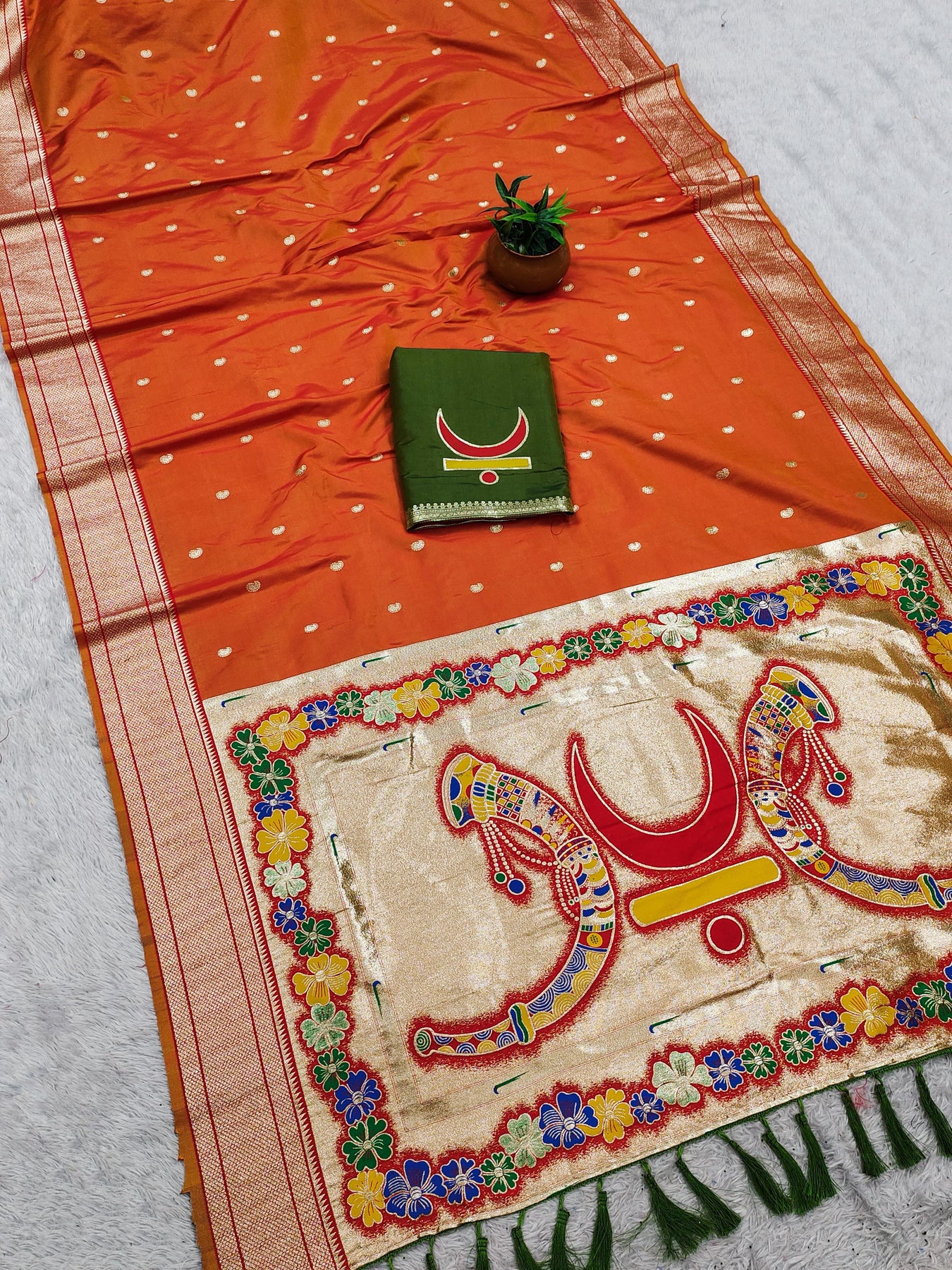 • Weaving: Authentic Paithani Handloom Style